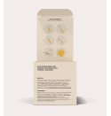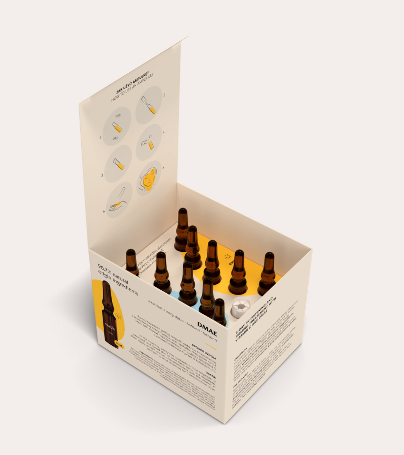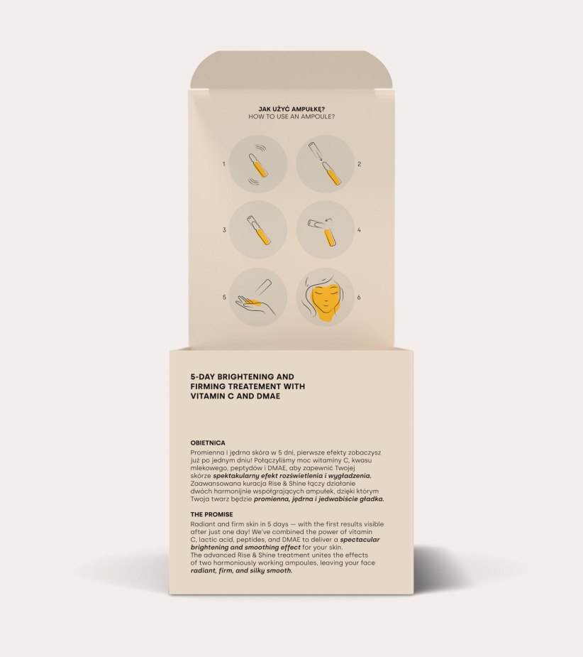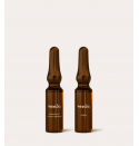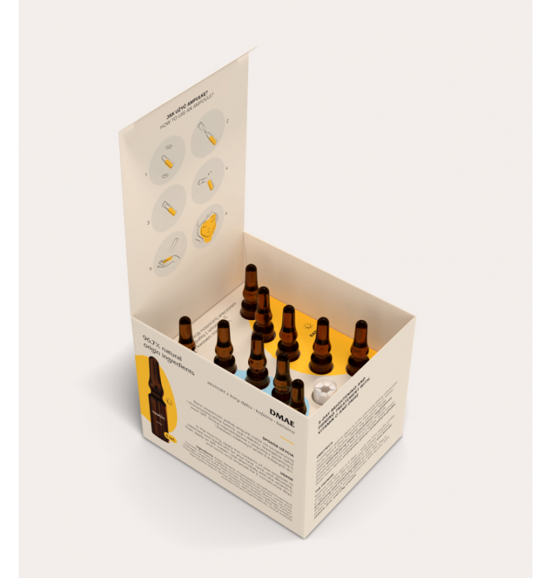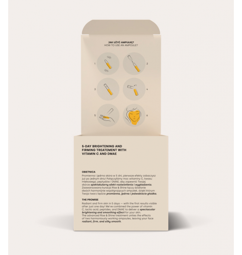 La vitamina C stabilizzata presente nelle fiale per la notte non solo illumina ed uniforma il tono della pelle, ma promuove anche efficacemente la sintesi del collagene, aumentando la tonicità del viso. L'acido lattico esfolia invece la cute in maniera delicata e la idrata. Il DMAE (dimetilamminoetanolo), presente nelle fiale per l'applicazione mattutina, supporta il tono muscolare, con un effetto rassodante immediato.